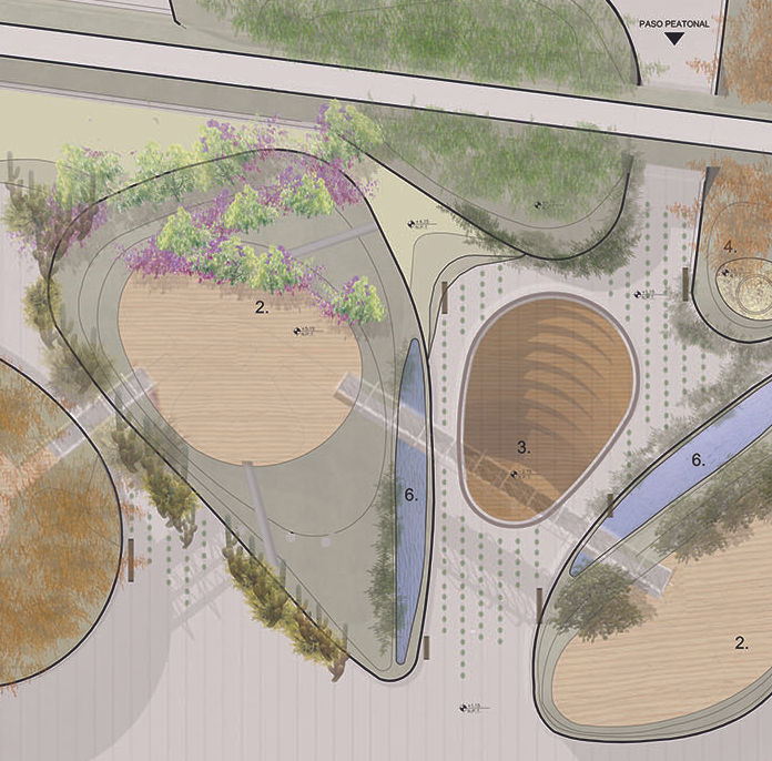 Es a partir de esta geografía también, que el parque se vincula al tren y a la ciudad. En el caso del tren, el talud existente es intervenido como parte del parque, adquiriendo un lenguaje similar, generando paisaje e integrándose al mismo. No se lo considera una barrera sino que se facilita el trasvasamiento hacia la Av. Juan B. Justo como un lugar de oportunidad para enriquecer el espacio público de esta vía en pleno desarrollo, anticipando la existencia del parque y dando lugar a la generación de una escala peatonal de aproximación.